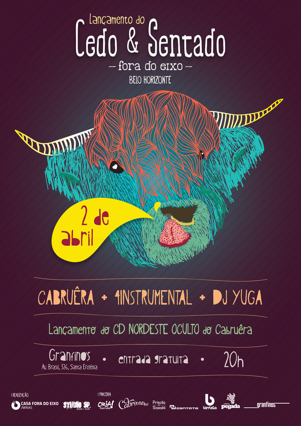 O calendário cultural de Belo Horizonte ganha nova opção para quem gosta e valoriza a nova música brasileira. O projeto Cedo e Sentado Fora do Eixo, realizado pelo Studio SP Produções e pelo Fora do Eixo, chega à cidade ocupando, quinzenalmente, as noites de segunda-feira com grandes shows gratuitos. No próximo dia 2, o lançamento do projeto traz a banda paraibana Cabruêra, que fará o lançamento do seu novo CD, Nordeste Oculto, e ainda os mineiros da 4Instrumental e discotecagem de DJ Yuga, a partir das 20h na casa de shows Granfinos.